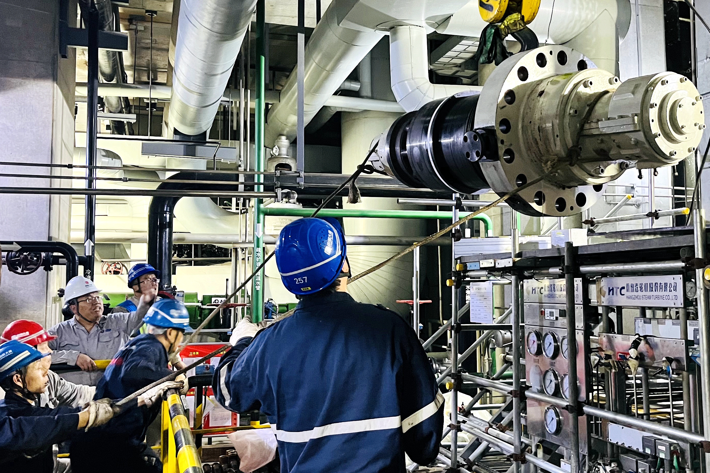 下午3點,2號機零米給水泵處,日光順著層間通道的高窗斜切進來。“起鉤——慢著,左擺半寸!”秦嶺發電公司承攬富平熱電維檢工作的項目部汽機專工李強攥著對講機的指節泛白,安全帽檐下的眼睛緊盯著半懸的給水泵芯包。起重工武強握著吊機操作桿,指腹貼在按鈕上緩著勁:“收到,擺幅控制住了。”這龐然大物裹著剛檢修完的金屬冷光,已吊至泵體上方,正等著“登堂入室”嚴絲無縫嵌進泵體里。